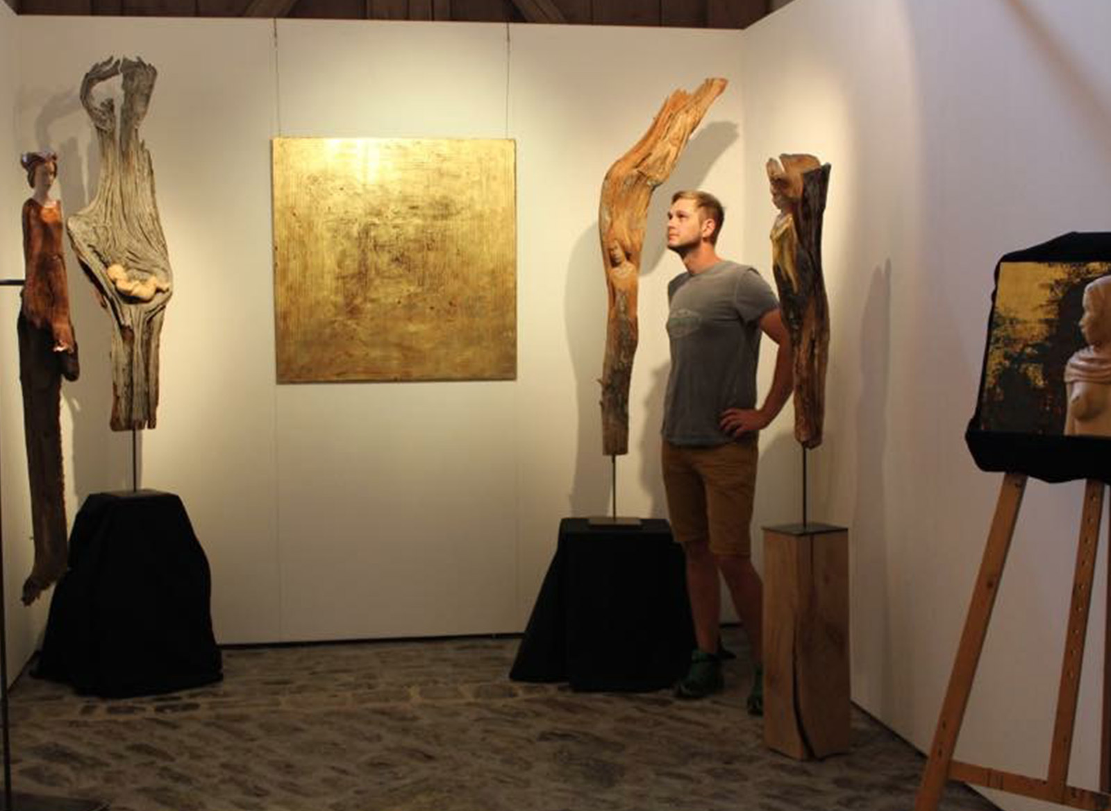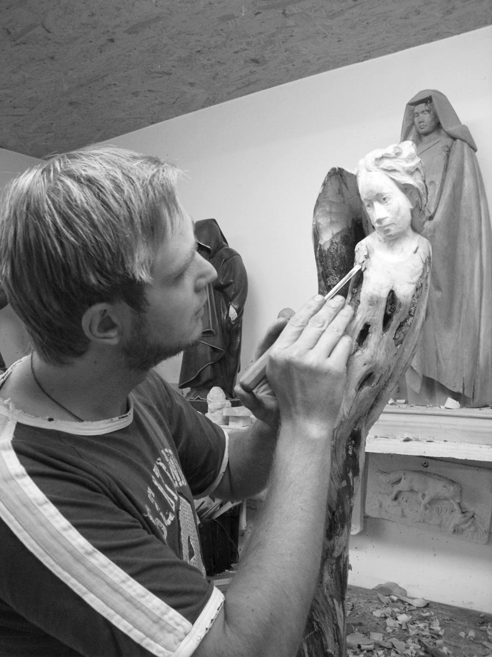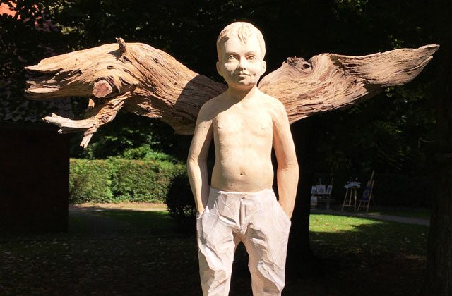 Aus den von der Natur vorgeformten Holzstücken befreit der Bildhauer Ronny Denner seine Figuren, indem er versucht, die vorgegebene Struktur nicht allzuviel zu verändern. Mit dem Ziel, aus Altem etwas Neues zu erschaffen, ohne dem Holz seinen Charakter zu nehmen, entstanden Engel und Frauengestalten.
